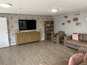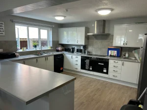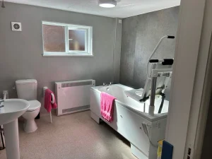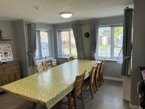 We have spacious communal areas such as a dining room and kitchen, great for enjoying tasty meals together! We also have two bathrooms in our home, one of which has been adapted for accessibility purposes with rails and ceiling tracking.