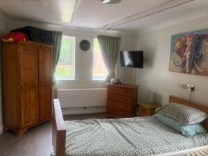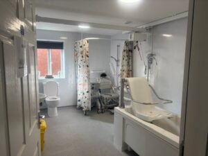 We have five comfortable bedrooms, two of which are equipped with overhead tracking hoists. Each bedroom has its own en-suite bathroom, including a toilet and sink.